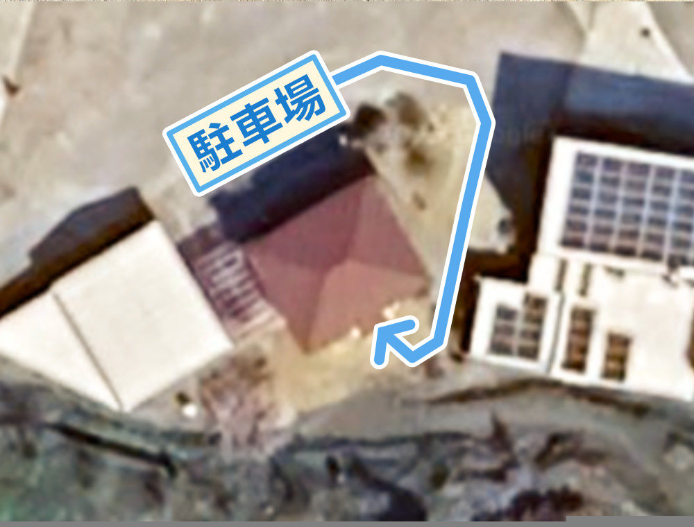 白いスロープを通り越し、そのまま建物を回り込むようにして奥へお進みください。裏手に入り口がございます。インターホンを押してお呼び出しをお願いいたします。